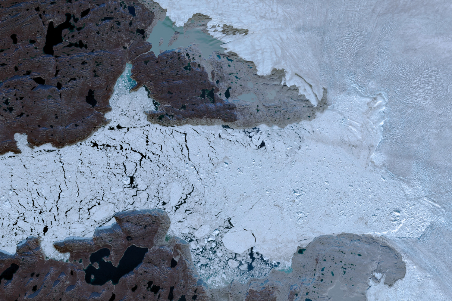 These two satellite images taken on September 5, 1985 and September 17, 2025 show the significant retreat of the Jakobshavn Glacier (Sermeq Kujalle), on the west coast of Greenland.