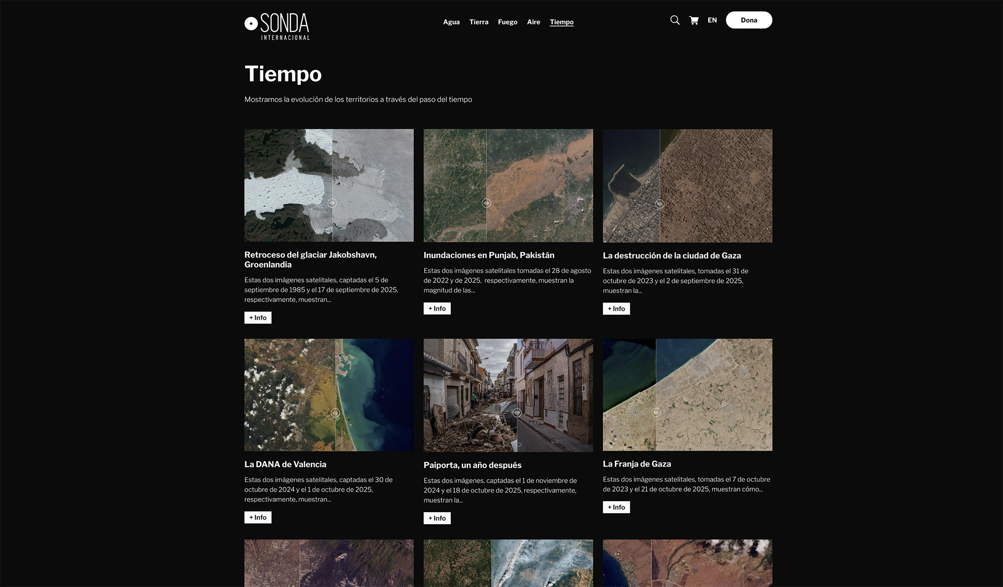En 2025 hemos publicado comparativas de fotografías satelitales, y también realizadas cámara en mano, que muestran la evolución de distintos territorios en Irán, España, Gaza, Turquía, Pakistán, Estados Unidos, Suiza y Groenlandia.