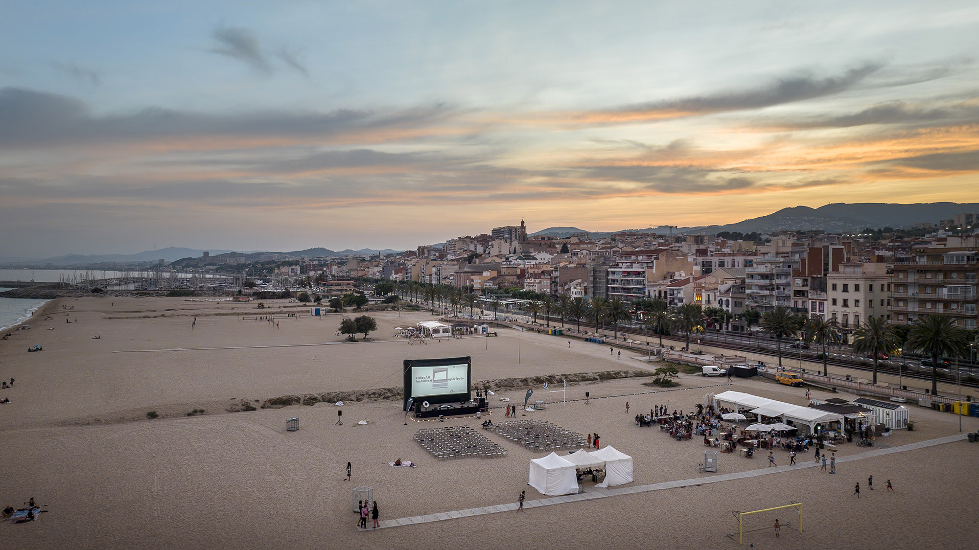 Vista aérea de los preparativos para las proyecciones nocturnas del Festival LaSal, en la playa de El Masnou, provincia de Barcelona. © AGfotodrone