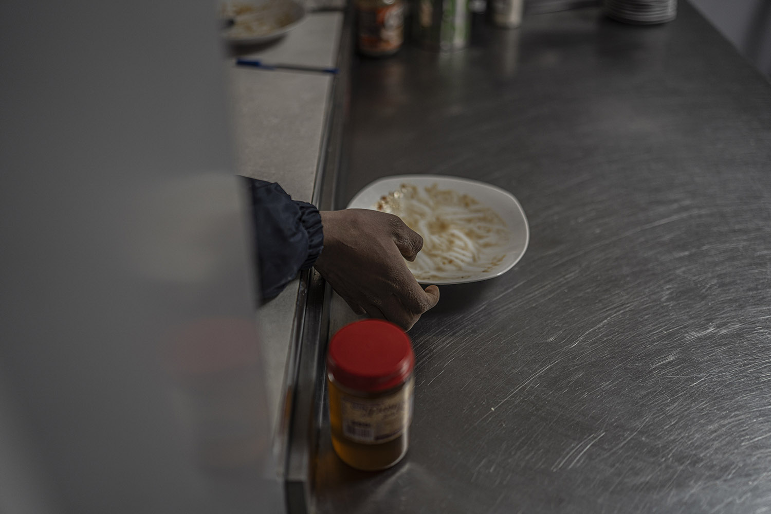 El ruido del murmullo y las sillas en movimiento se ha calmado y solo permanece el sonido metálico de los cubiertos. Los trabajadores comen en silencio.
