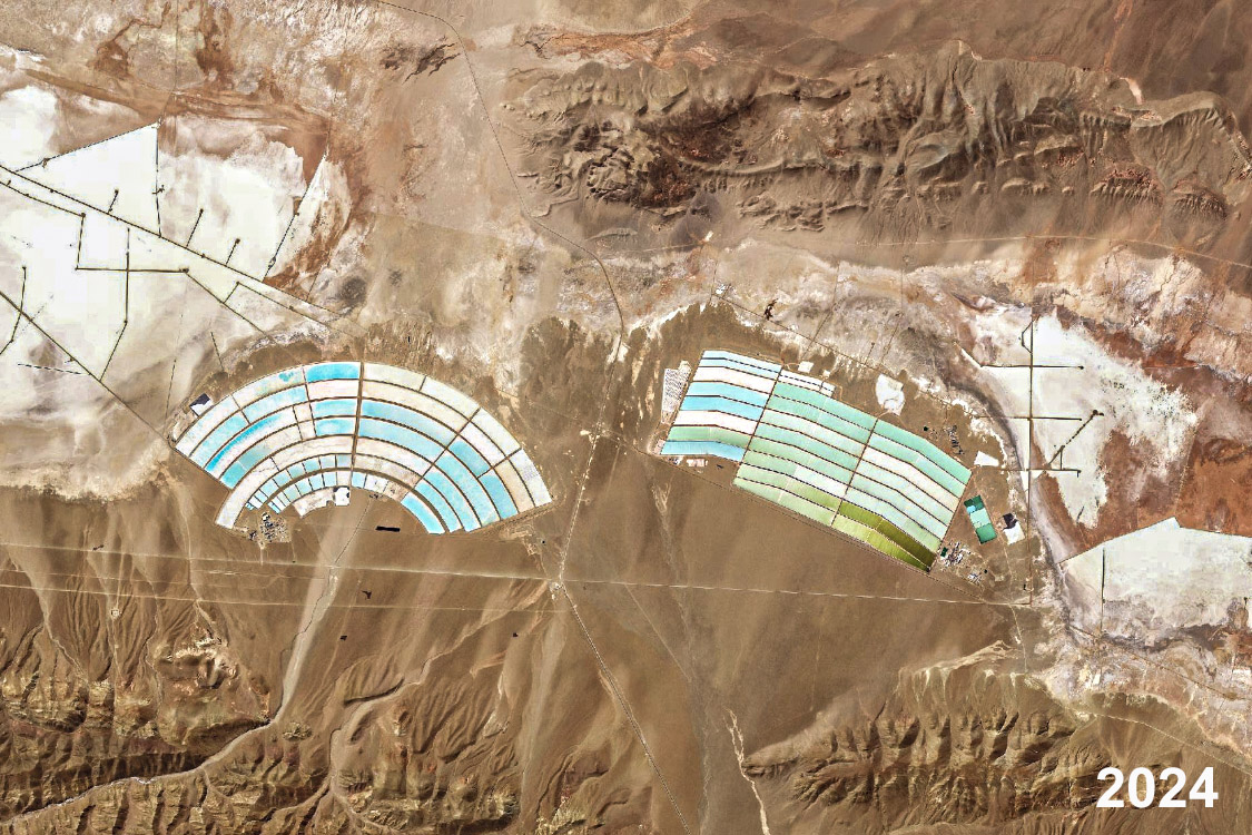 Imágenes satelitales, realizadas en 2009 y 2024, de las instalaciones de las mineras Exar y Sales de Jujuy, en el Salar de Olaroz Chico, provincia de Jujuy, Argentina. Crédito: Planet Labs.