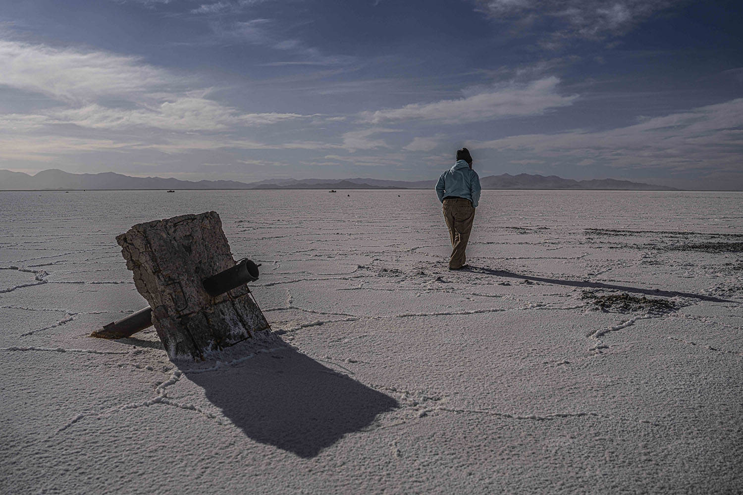 Eulalio Barconte recorre restos de las tuberías instaladas para las exploraciones de litio en Salinas Grandes de Jujuy.