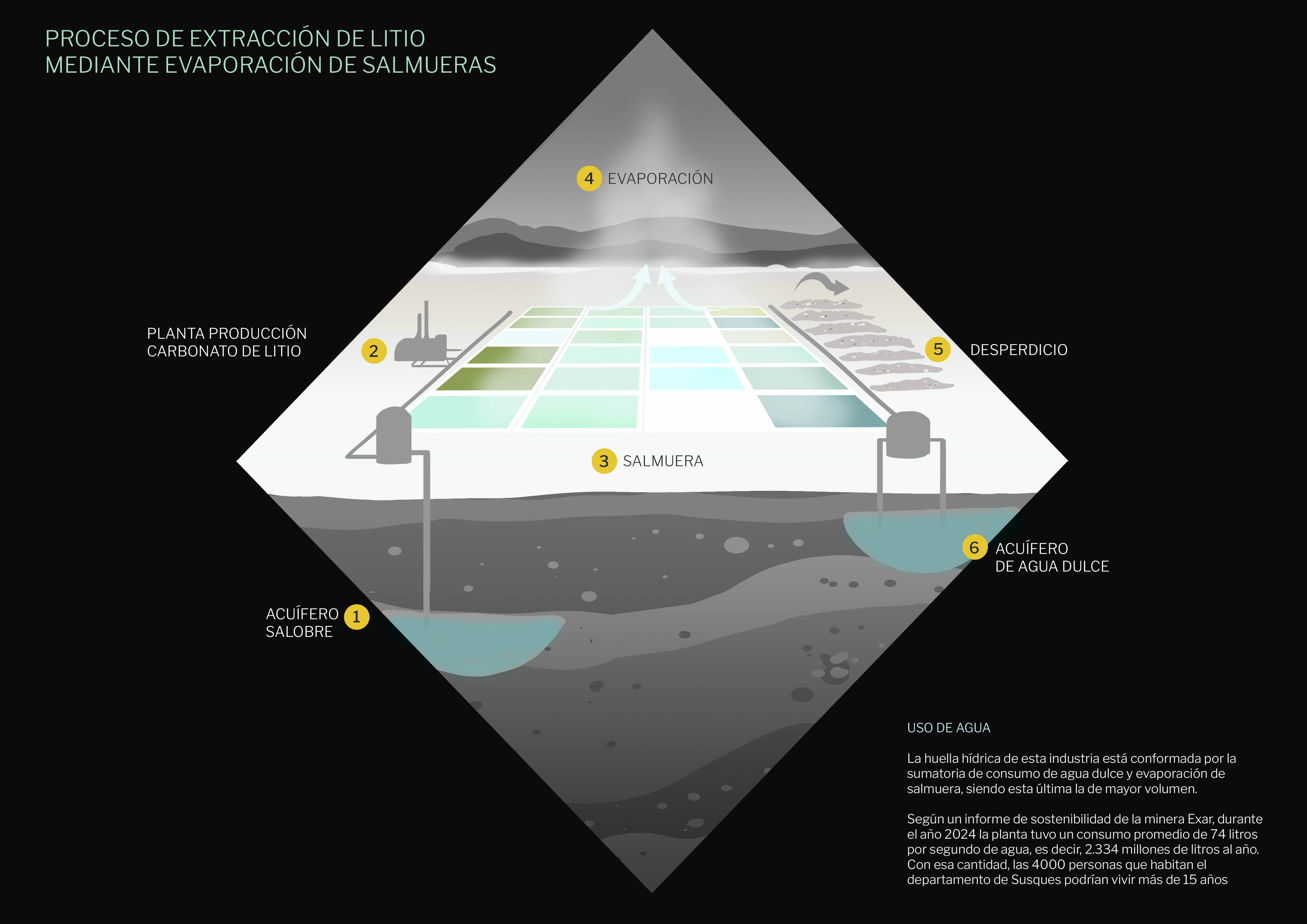Desde que la palabra litio llegó a la puna argentina en 2009, se repite el mismo temor: que aumente la escasez de agua -propia de la región- debido al alto consumo que realizan las plantas de extracción de este mineral mediante el método de evaporación con salmueras. Esta técnica consiste en bombear millones de litros de agua salada (salmuera) del subsuelo de los salares y dejarla evaporar durante meses para aumentar la concentración de litio que contiene ese recurso hídrico. Son justamente las condiciones áridas de esta zona las que permiten este método, de bajos costes respecto a otras alternativas y que algunos científicos llaman “una minería de agua”.